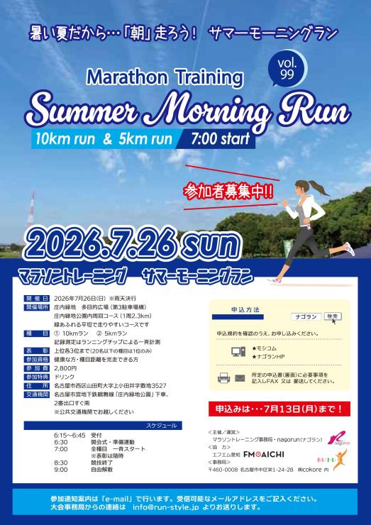 暑い季節こそ、走るなら“朝”が気持ちいい!2026年7月26日(日)に開催!会場は緑豊かで走りやすい庄内緑地公園。1周2.3kmのフラットな周回コースで、初心者からトレーニング目的のランナーまで幅広く楽しめます。種目は10km・5kmの2種目。
