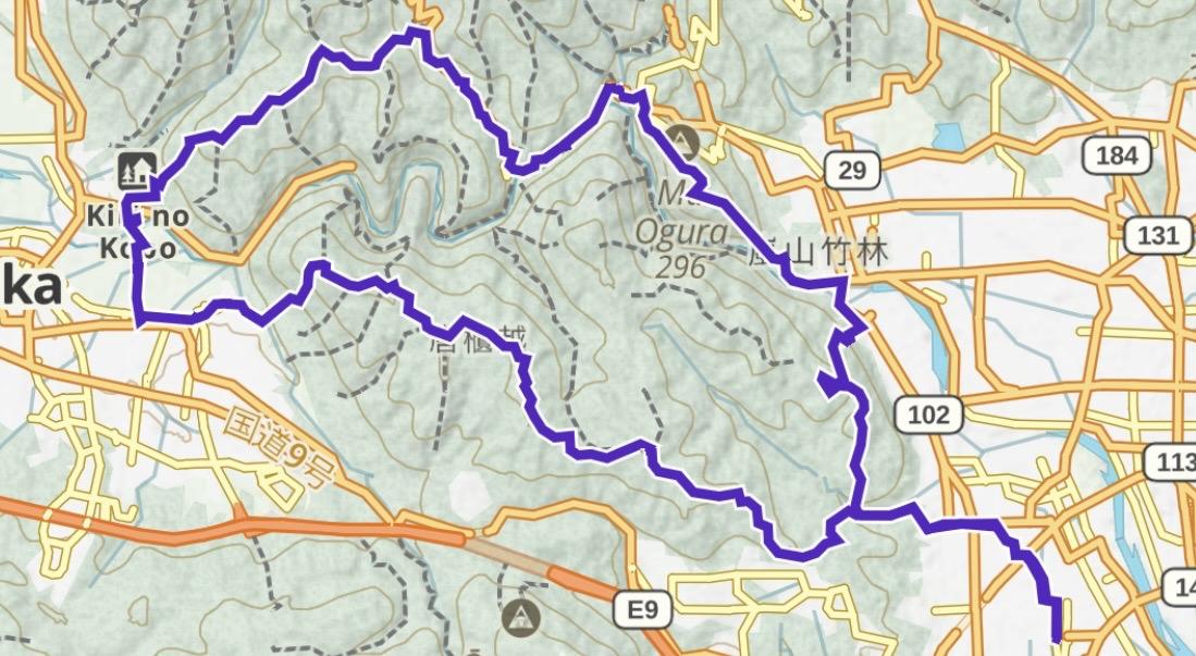 上桂駅→苔寺→沓掛山(414m)→唐櫃越→みすぎ山(430m)→馬堀駅→明智越→高瀬山(340m)→保津峡→六丁峠→小倉山(296m)→嵐山→松尾山(275m)→上桂駅