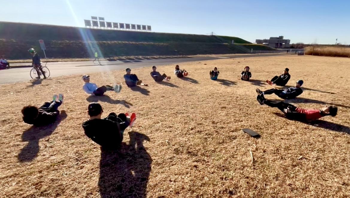 走行前には動きづくりドリルや補強トレーニングを行い、フォームを整えた上でメイントレーニングに入ります。