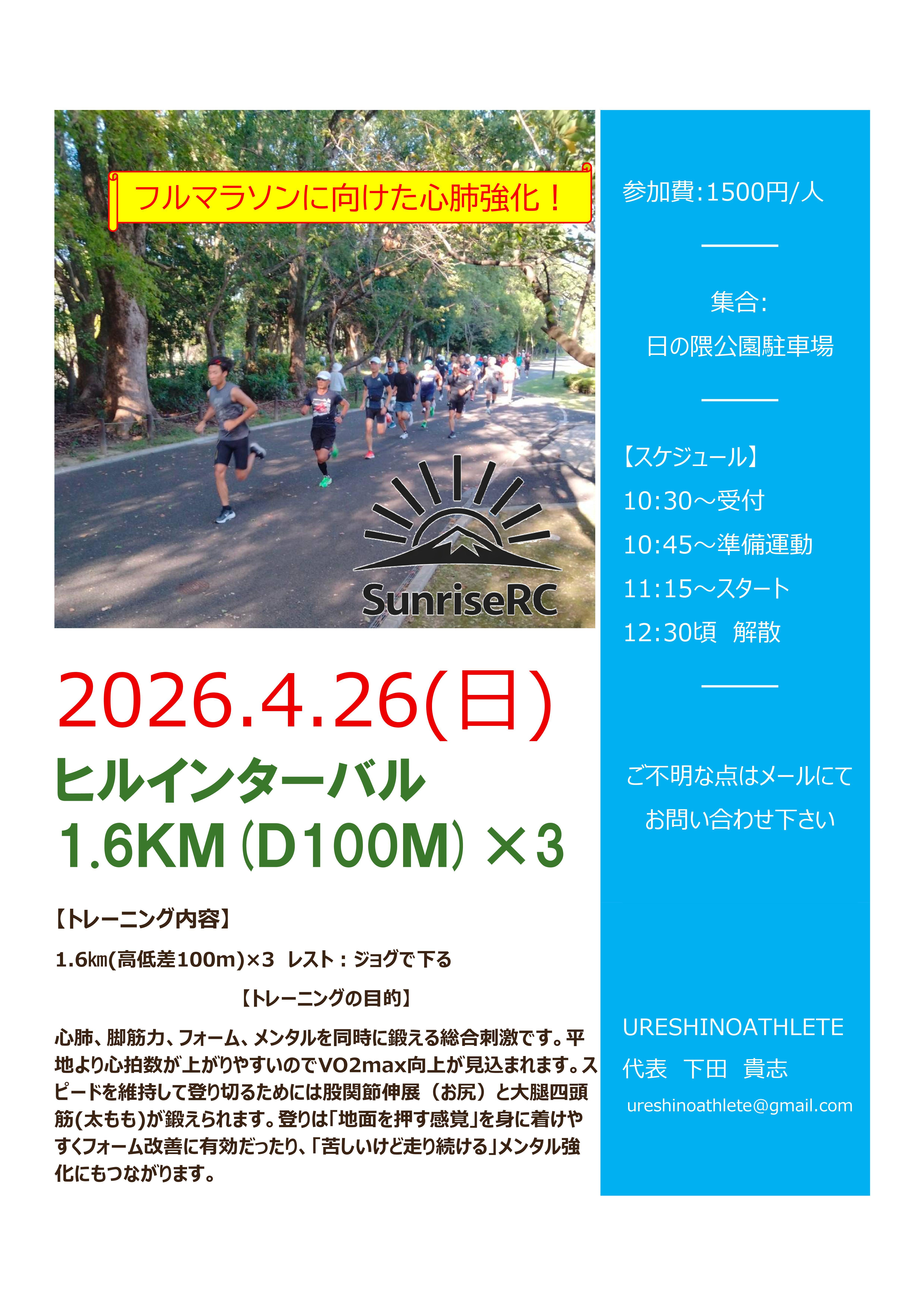 昨季のマラソンシーズンの出来はいかがでしたでしょうか?今回は地味でしんどい練習「ヒルインターバル」を開催します。1.6kmで標高100m上るコースを走ります。心肺機能、脚筋力、ランニングフォーム、メンタルを同時に鍛える練習で、やり切ったあかつきには、強い身体と折れない精神力を手に入れてると信じて頑張ってみましょう!
