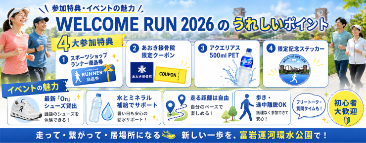 春の富山・環水公園で開催される「WELCOME RUN 2026」は、タイムを競うのではなく、街の風景や仲間との交流を楽しむイベントです。初心者も経験者も、あるいは歩きたい方も大歓迎。富山のシンボルから新しい「つながり」の一歩を一緒に踏み出しませんか?あなたの参加が街を元気づける彩りになります。心地よい風を感じながら、笑顔で新しい春を走り出しましょう。