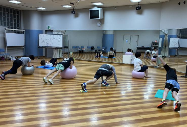 2)自体重負荷やチューブ負荷、バランスボール等をグッズを使い、下半身と体幹の筋トレを行います。