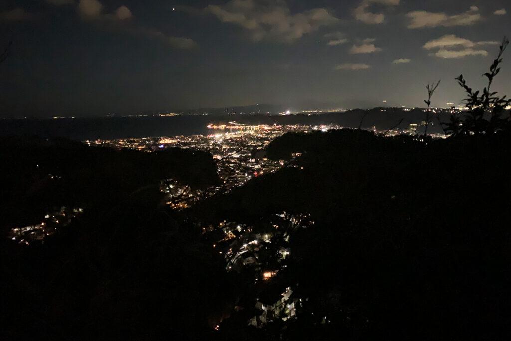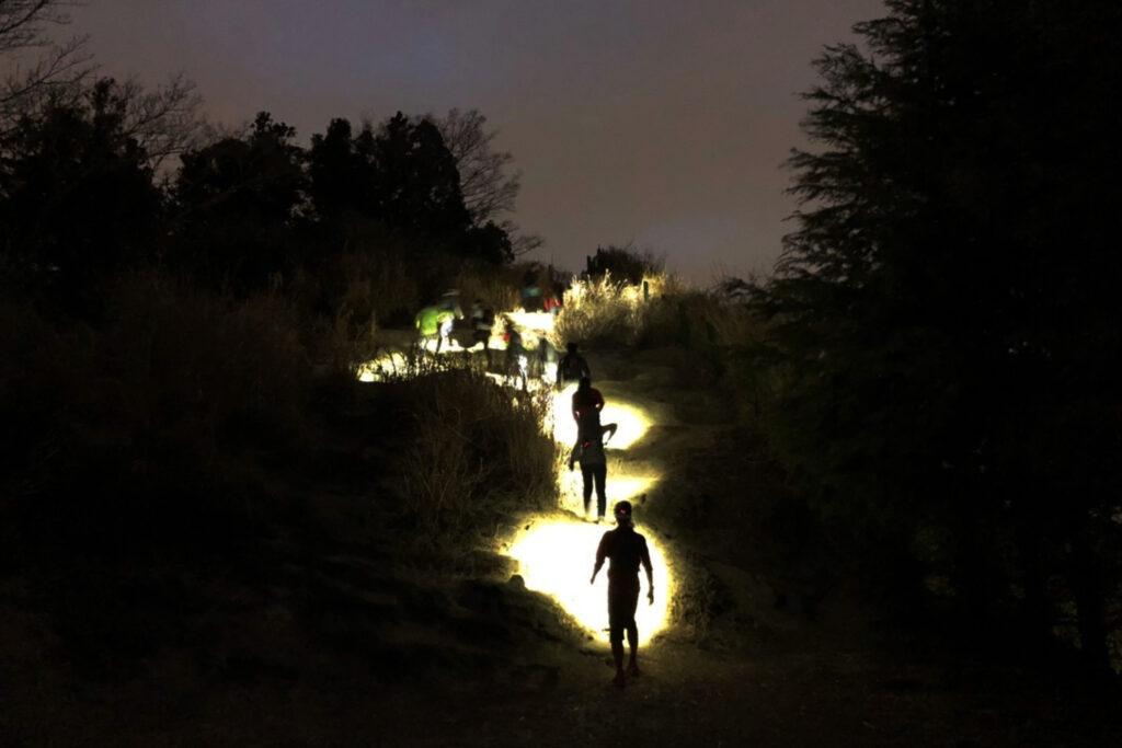 ヘッドライトで足元を照らしながらトレイルを登り、山頂へ。目の前には、海沿いの街の明かりがパッと広がります。夜の山頂で味わう開放感は、ナイトトレイルならではの特権です。