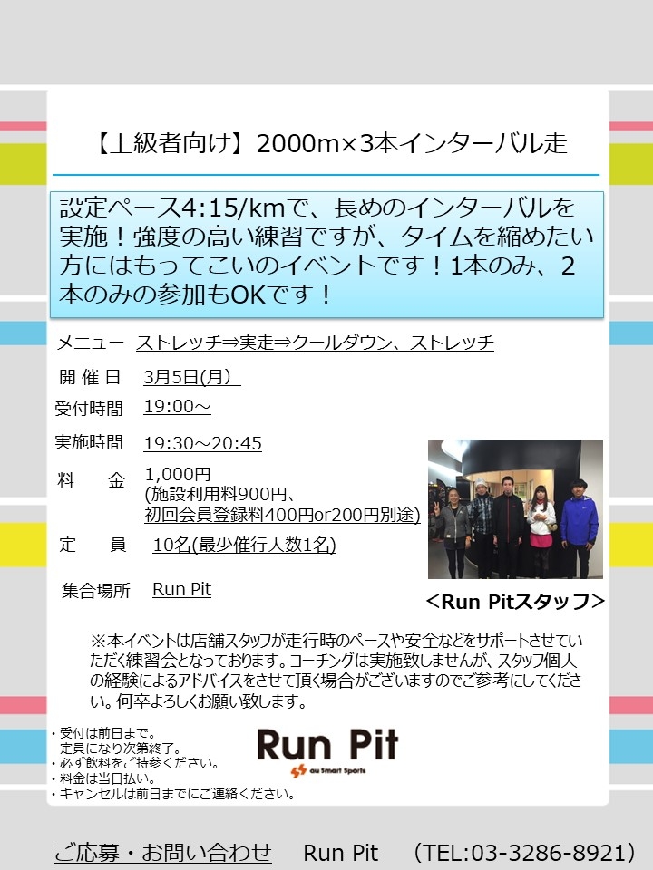 設定ペース4:15/kmで、長めのインターバルを実施!強度の高い練習ですが、タイムを縮めたい方にはもってこいのイベントです!1本のみ、2本のみの参加もOKです!