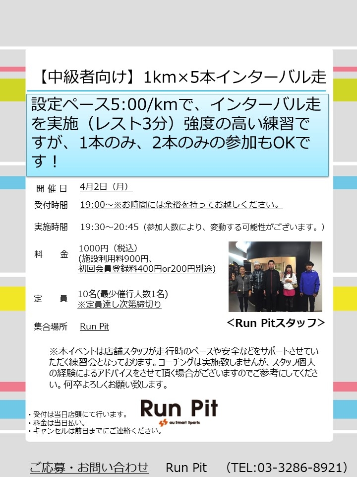 設定ペース5:00/kmで、インターバル走を実施(レスト3分)強度の高い練習ですが、1本のみ、2本のみの参加もOKです!