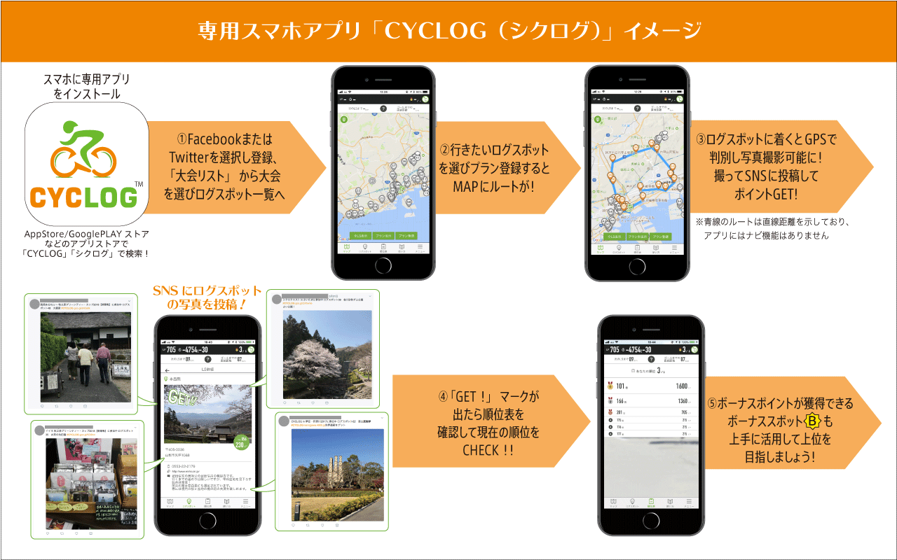 『CYCLOG in 神戸(シクログ イン こうべ)』とは、神戸市内に設置されたチェックポイント(ログスポット)を専用スマホアプリ「CYCLOG(シクログ)」を使用し撮影してSNSに投稿、ポイントを獲得していく時間制限制自転車ポイントラリーイベント。