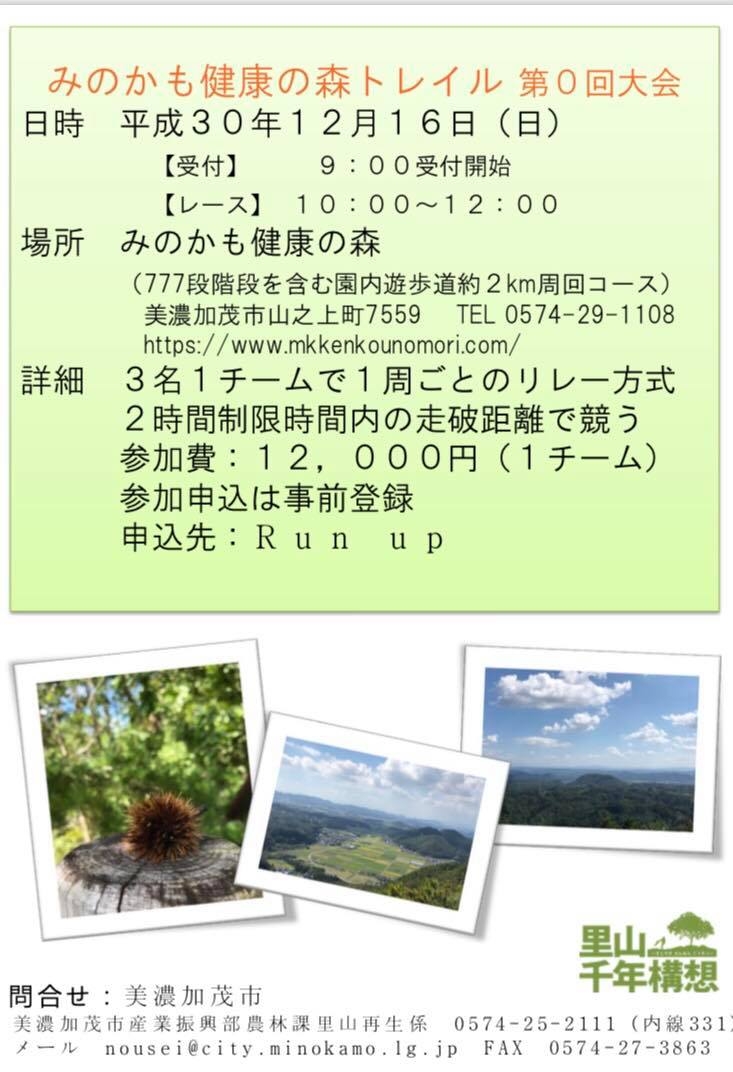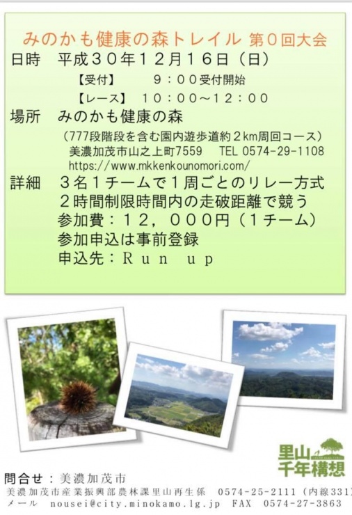 美濃加茂市の「みのかも健康の森」内を会場とし、トレイルランニングイベント “みのかも健康の森トレイル・第0回大会” を開催します。