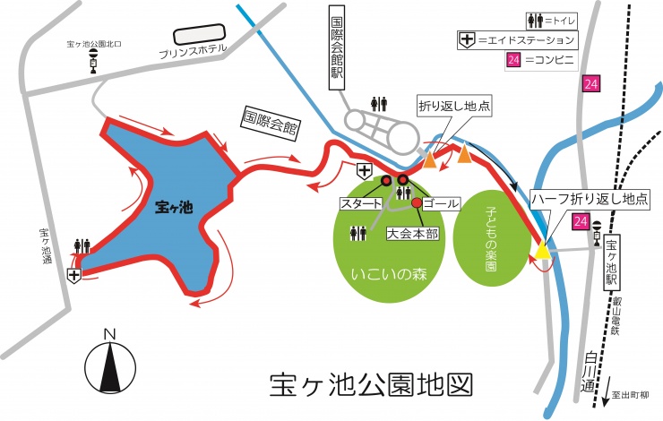 大会コース:宝ヶ池公園コース(1周:2.5km、一部アスファルトの土道)を周回するコースになります。(地図はクリックで拡大します)給水所は約1.5kmごとに一カ所ございます。