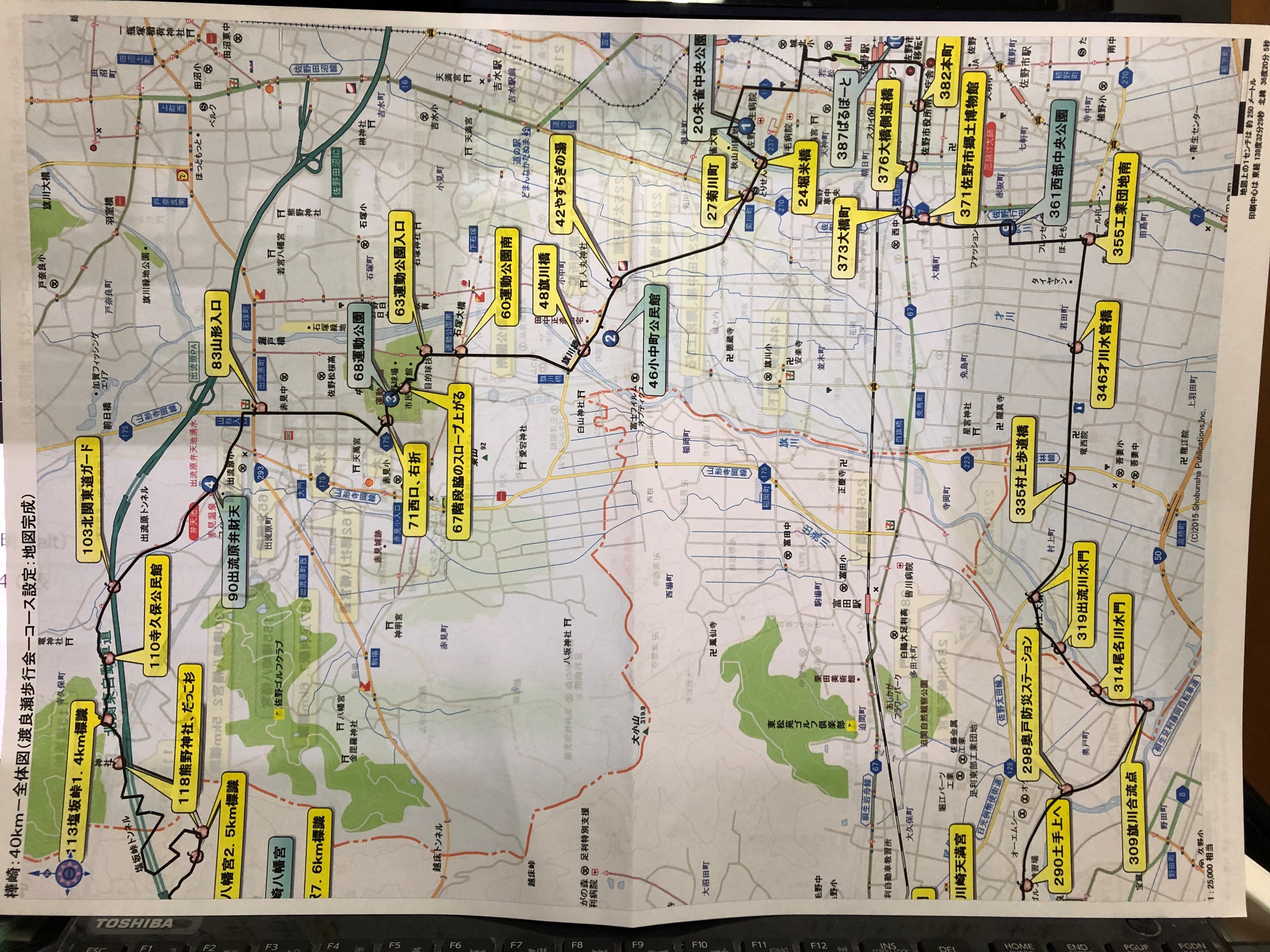 ぱるぽーと、WC〇(スタート時、フル・ハーフともに、セルフチェック、時間・歩数・距離=歩数*歩幅を記入)‐01城山公園‐02万葉の里城山記念館ー04慰霊碑、左側階段を下りる‐05税務署前、右折‐06Y字路、左折‐07若松アンダー手前、右折‐08アンダーへ横断歩道、左折‐11信号渡り、右折、CVL‐12横断歩道渡り、直進、県道151号へー15向介護施設ー16CV7、信号、左折ー①20朱雀中央公園、公園内WC▲ー21南西出口、左折ー24T字路、右折、堀米橋‐27菊川町‐30堀米地蔵堂(田中正造ゆかりの地)‐標識6km赤見へ、右カーブ‐41佐野市消防団第8分団第2班(小中)前‐42やすらぎの湯、SGC、宮下橋‐②46小中町公民館前WC▲、田中正造翁生誕の地、史跡田中正造邸宅‐47小堀へい音生誕の地ー48旗川橋‐50旗川橋信号渡り、右折(左側歩道)、県立佐野松陽高等学校看板‐60運動公園南-63佐野市運動公園入口、左折‐64佐野市市民体育館‐65テニスコート手前、右折、野球場スタンド脇、直進ー66階段左側スロープ上がりー③68運動公園WC▲、左折ー71西口、右折ー72止まれ、右折‐83山形入口、信号、直進(左側歩道)CV7‐84┫字路、標識手前、左折‐89出流原小学校入口看板‐④90出流原弁財天、磯山公園WC▲、涌釜神社(ハーフ前半の中間、セルフチェック、時間・歩数・距離=歩数*歩幅で計算し記入)‐91名水(一乃館入口右側)‐97関東ふれあい道、塩坂峠3.1km看板‐103北関東道ガード‐110佐野市消防団第12分団第3班、寺久保町公民館、WC▲‐113塩坂峠1.4km看板、左折、登り20~30分‐115出流原弁財天2.4km看板先、左折、塩坂峠1.3km、左折‐118熊野神社、だっこ杉‐128塩の井戸‐130下り、樺崎八幡宮2.5km標識‐136樺崎八幡宮1.8km‐141北関東道脇、塩坂峠1.3km、左折、下り20~30分‐142ガード足利12、左折‐144左カーブ、右折、田んぼ道へ‐147関東ふれあい道標識、左折‐148北関東道ガード足利9‐(OP151無量寺へ左折‐153無量寺)‐154標識右折ー⑤155樺崎八幡宮ー156左側へ下りー157足利駅7.6km標識、右折‐160足利駅7.2km標識、左折ー162郷社八幡宮道、右折ー164先の横断歩道渡り、左側歩道へー165北郷橋ー166北関東道出口ガード‐168足利駅6.3km標識、直進ー169光得寺前‐170信号、直進‐172名草川、高橋渡り、左折‐176第二柳橋ー177弁天橋‐179柳原橋渡り、右折下りる‐180橋手前、右折、桜並木‐182メガネ橋渡り、右折‐183宮前橋渡り、左折‐186新梶川橋、右折‐189利保町1丁目、CV7‐191袋川、内田橋‐192内田橋西、SS,信号直進、左側歩道へ‐193ときたクリニック、左折‐194幼稚園手前、右折、足利教会手前、左折‐195広い道路右折‐直ぐにあずま家、左折‐197旧袋川、田原橋‐199足利総合運動公園へ右側車止め、直進‐200プール手前、右折ー201WC▲手前、左折‐⑥202野球場裏WC▲‐陸上競技場西、南へ‐205総合運動公園南‐206図書館‐207足利女子高脇‐212裁判所前、信号渡り、右折-213CV7‐214旭町‐217けやき小学校前左折‐219鑁阿寺北門WC▲‐220経堂、大御堂ー⑦221山門、手前左WC▲‐223なか川、左折‐224足利学校入口‐足利学校看板、左折‐石畳右折‐225昌平町歩道橋渡り右へ下りる、太平記館、観光案内所(フルの中間、セルフチェック、時間・歩数・距離=歩数*歩幅で計算し記入)ー226地下道入口、左右左、階段上がるー228CV7、右折(ハーフ前半終了・ハーフ後半スタート時、セルフチェック、時間・歩数・距離=歩数*歩幅で計算し記入)ー229駐輪場脇。地下道へ、両毛線ー230道路、左折ー231信号右折ー232田中橋階段上がるー233信号渡り左折ー⑧239WC、伊勢町樋管‐241岩井橋、サイクリングロード下りる‐244福寿大橋下、道なり右折、分岐左折ー262車止め直進ー265福猿橋下ー267車止め直進ー270車止め直進ー274コンクリートブロック(芝生養成中の為に階段上がる)直進ー278コンクリートブロック直進-279コンクリートブロック、左側階段上がり、右折‐280袋川水門wc、右側土手へ‐283左折、土手下へー284川崎天満宮、直進ー286川崎橋ガード‐290右折、土手上へー298奥戸防災ステーション-302河川監視カメラー309旗川合流点(ハーフ後半の中間、セルフチェック、時間・歩数・距離=歩数*歩幅で計算し記入)‐314尾名川水門‐319出流川水門‐324村上大橋、右折‐335村上歩道橋、CV7‐336吾妻北小‐342CVL‐346才川水管橋-355工業団地南信号、左折ー360ユース、右折ー⑨361西部中央公園、WC✖、中央公園橋左折362‐364西部菊沢橋‐368上公園橋‐369Y字路、左折‐370佐野市総合福祉センター‐371佐野市郷土博物館1‐372旧50号、右折‐373大橋町、信号渡り、左側歩道へ‐375大橋町歩道橋、左折‐376秋山川、大橋側道橋‐377大町通り‐382本町‐383東石美術館、万町駐車場‐384佐野駅入口‐385市役所‐386CV7‐⑩387ぱるぽーと山道加算1.3km=40km(フル・ハーフ後半ともに、ゴール、セルフチェック、時間・歩数・距離=歩数*歩幅で計算し記入)WC〇