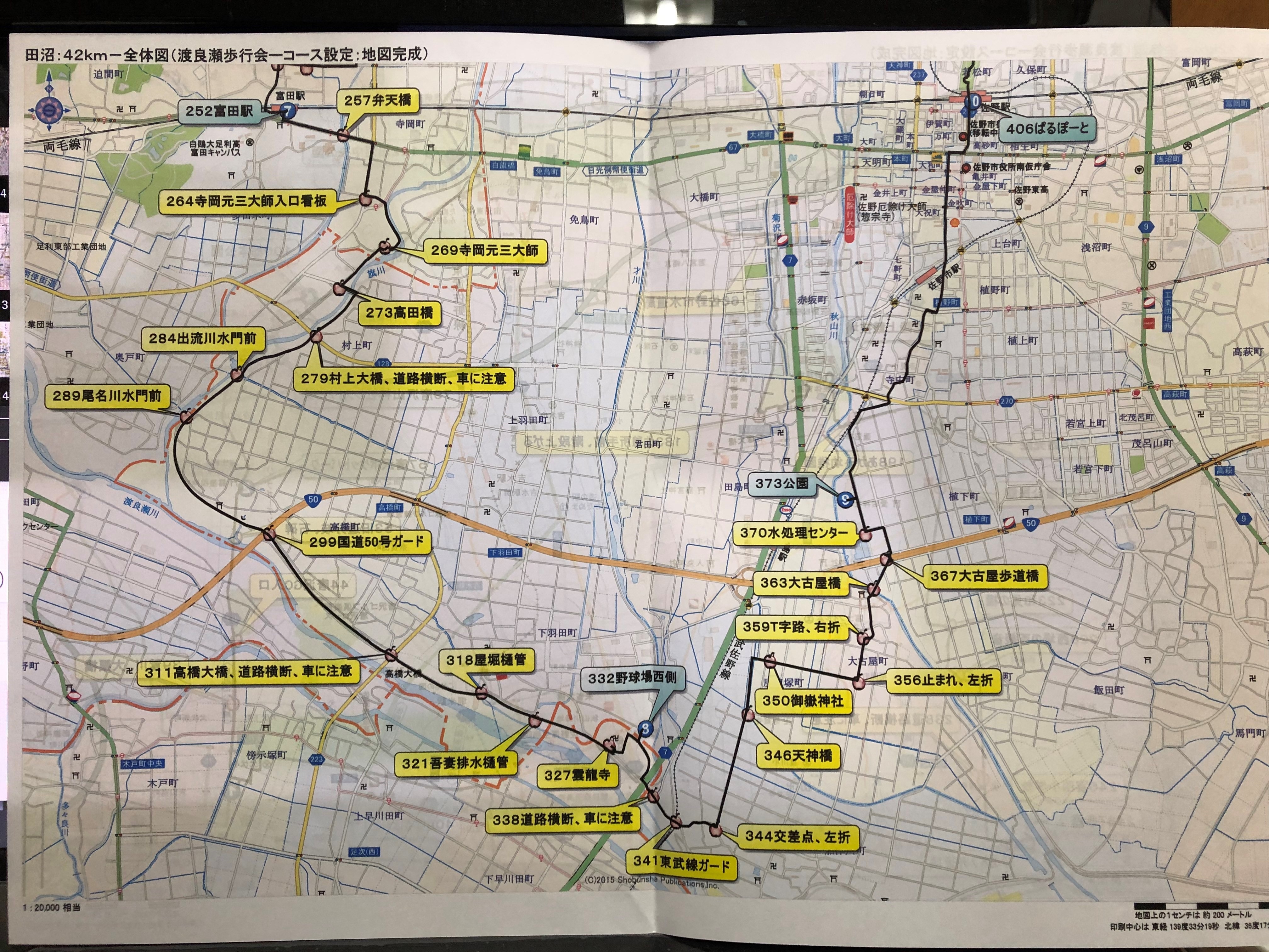 ぱるぽーと、WC〇(スタート時、フル・ハーフともに、セルフチェック、時間・歩数・距離=歩数*歩幅を記入)ー01城山公園口ー02万葉の里城山記念館、池、橋渡りー03本丸跡、北出丸ー04慰霊碑、左折-05税務署、右折-06Y字路、左折ー08若松アンダー手前、右折ー09CV7ー10内堀米西ー13内堀米ー18堀米町、左側歩道へー26犬伏町歩道橋ー27犬伏小学校、右折ー28左折すぐに右折29ー30止まれ、車に注意、道路横断、左折ー①31犬伏地区公民館WC▲ー32戻り、右折ー33左折、横断歩道渡り、直進ー34┫字路で、左側歩行ー35犬伏町、左側歩行ー39わし川、大栗橋ー44唐沢GC入口‐53旧道分岐、唐沢山神社道、石碑‐②57唐沢山鳥居‐ポケットパーク、WC▲、上富士町公民館‐58唐沢山神社1.3km標識、露垂根神社、砂利奥の山道へ‐62二股、左折‐68分岐、左折‐70二股、右折上へ、つつじヶ丘入口標識‐71参道、右折‐唐沢山神社看板‐社務所、見晴らしー72南城跡‐戻り、階段上がり、73参拝‐左奥休憩所脇、鳥居から出て、二の丸、右折‐75弓道場‐道路、左折‐77右カーブ先、左折-78神橋、右折、大炊の井、八大龍王神‐案内板、天狗岩、ます形‐③79唐沢山神社レストハウス、WC〇、関東ふれあいの道、松風のみち標識、右折‐駐車場北進ー80田沼方面へ右折‐84カーブ8標識ー87カーブ5標識ー92カーブ2標識ー93神社鳥居手前右折、東京農工大学看板方向へ‐96貯水池、右カーブ左折‐97栃本公園半周‐④100栃本公園WC△‐101遊人里の郷、栃本公園出口右折‐104旧田沼高校前‐105秋山川、唐沢橋‐106栃本小学校前‐107栃本小学校西‐111栃本町-CV7‐112県道115号標識‐116たぬまふるさと館、佐野市あそ商工会館、まちの駅、WC‐117踏切渡り直進、右100m田沼駅‐119一瓶塚稲荷神社‐参拝後、左脇に下り右折、121裏口、左折‐すぐ右折、⑤122田沼中央公園、WC▲(ハーフ前半の中間、セルフチェック、時間・歩数・距離=歩数*歩幅で計算し記入)‐124公園、東口出口、左折‐125止まれ、直進-127信号渡り、直進、CVL、国道293号横断‐128佐野市民病院、右側歩道へ、横断歩道渡り、バス停、右折‐130出口、左折‐140信号、直進、田沼庁舎入口、県道201横断、CV7、CVL-144市営バス待合所、直進-145田沼中央公民館、WC▲-146田沼アリーナ北側、直進-147西口出口、左折-150信号、直進、県道66号線横断-155信号渡り、右折、国道293号線、左側歩道へ-157向CVD-158戸奈良南-164北関東道ガード‐164石塚町、CVL‐166佐野市水道局、公園水道水(夏は冷水で身体を冷やす)、渥戸橋‐168橋渡り、左折‐旗川土手上、砂利道へー174簡易wc✖先‐175河川敷歩道へ坂下る‐176芝生脇道‐181水路橋渡り‐183屋根付き休憩所手前、階段上がり‐駐車場抜けて‐185押しボタン信号渡り、運動公園内へ‐187テニスコート脇WC▲‐188野球場手前、左折、テニスコート北側、西進‐190ジョギングコース右折‐⑥192陸上競技場、WC▲‐193多目的競技場へ、道路横断注意、直進‐194砂利道、右折‐195道路、右折‐198あかみ幼稚園‐200次の信号直進、202信号、旧赤見小入口、左折ー203JA佐野赤見支店直進ー205赤見SS、西光院、信号左折ー209県道175号山形寺岡線ー210左カーブSS看板手前、下宿公民館先、右折、広い農道へー213止まれ、直進ー221水路脇道路、右折ー223和見の橋渡り、左折ー226観音橋、右折ー228西場の百観音(すぐ上に、秩父34・坂東33・西国33観音)ー230通学路看板、左折ー238止まれ、道路横断、直進、中学校ー242止まれ、右折ー246富田小学校ー248T字路、左折ー251踏切渡り、左折、線路脇道ー⑦252富田駅WC△(ハーフ前半終了・ハーフ後半スタート時、セルフチェック、時間・歩数・距離=歩数*歩幅で計算し記入)ー253駅入口、左折ー257向CVL、弁天橋ー259寺岡町、CV7、右折260‐264寺岡山元三大師入口看板、左折ー265道路横断、旗川脇道へー268下寺岡橋ー269寺岡元三大師、WC〇(フルの中間、セルフチェック、時間・歩数・距離=歩数*歩幅で計算し記入)ー273高田橋渡り、右折275ー279村上大橋、道路横断注意‐284出流川水門前‐289尾名川水門前‐293渡良瀬川合流‐296雀神社脇‐298佐野用水機場‐国道50号手前土手下りる‐299ガードー301土手上へ‐310車止め直進ー311高橋大橋、道路横断注意‐318屋堀樋管‐321吾妻排水樋管ー326車止めー327送電線手前、階段下りる、雲龍寺(ハーフ後半の中間、セルフチェック、時間・歩数・距離=歩数*歩幅で計算し記入)‐328坂手前、砂利道へ‐下水蓋へ、すぐ左折‐330右折‐331左折、砂利道へ‐⑧332野球場西側wc▲‐333元に戻りー334下水蓋、左折-337道路、左折、ガード潜り-338道路横断、注意、土手下道路へ、直進-341東武線ガード、二俣、左折-343自販機、直進-344交差点、左折、電柱の農道へー346天神橋ー349T字路、右折、橋渡り直進、広い農道ー350御嶽神社ー356止まれ、左折ー359┣字路、右折ー363大古屋橋渡り、直進ー367大古屋歩道橋、渡り、左折、国道50号線横断-370水処理センターへ、左折-371正門、右折-⑨373公園入口左折、公園WCー374公園入口戻り、左折ー381住宅手前、右折ー383車止め手前、左折、ガード2.5mー385祠手前、