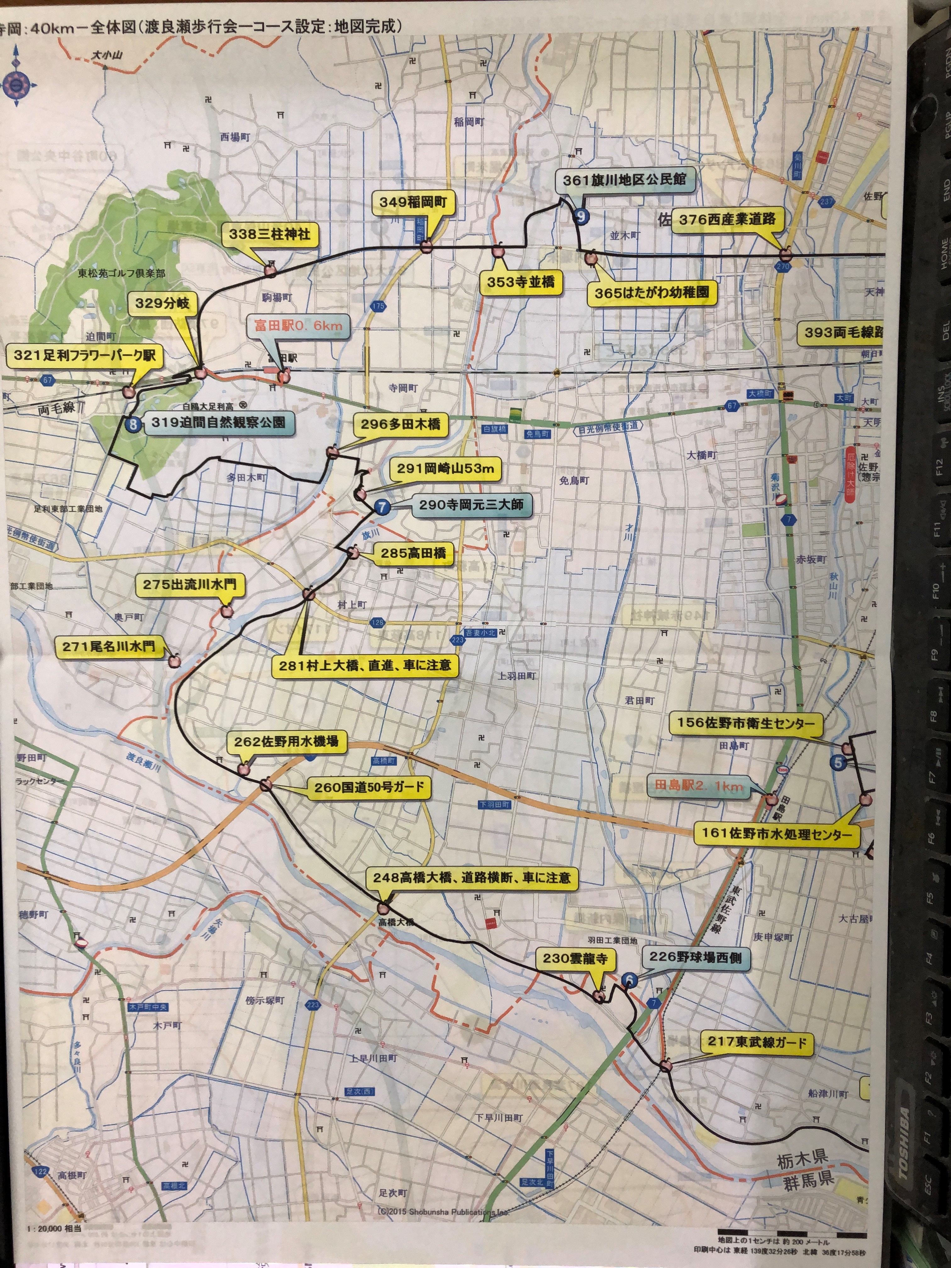 ぱるぽーと、WC〇(スタート時、フル・ハーフともに、セルフチェック、時間・歩数・距離=歩数*歩幅を記入)‐01佐野駅城山公園口‐02万葉の里、城山記念館‐04慰霊碑‐04税務署-05Y字路、左折‐06若松アンダー手前、右折ー08CV7、09‐10内堀米西‐13内堀米‐19堀米町‐20百観音‐29犬伏町歩道橋‐30犬伏小学校、正門脇、右折‐31左折、次の路地、右折ー32道路渡り、左折、車に注意ー①33犬伏地区公民館WC▲ー34入口戻り、右折ー37横断歩道渡り、直進ー40米山保育園手前駐車場、左折ー41T字路、右折ー43米山集会所脇wc✖ー45止まれ、右折ー46東北道ガードー47横断歩道渡り、右折ー49横断歩道渡り、左折ー51太陽光発電先、右折、橋渡り、左折ー52道路、右折ー53両毛線踏切ー54倉庫手前、右折、すぐ右折ー55押しボタン信号渡り、直進ー56町谷西公園ー57工業団地スロープへ左折ー58車止め直進ー59道なり、右折ー②60町谷中央公園WC▲、左折ー62町谷公民館入口、直進ー63道路渡り、右折ー65横断歩道渡り、直進ー67みかもクリーンセンターー68止まれ工業団地看板、左折ー71西口駐車場入口ー73みかもハーブ園入口、ハーブ園へ右側より一周‐③77香楽亭、WC△‐78みかも山公園西入口‐79二股左側直進ー④86万葉庭園、WC△‐左側半周‐88コンクリート橋、渡り‐90WC▲‐91出口左折‐92東北道ガード佐野9‐93T字路右折‐50m┫字路左折‐30m┣字路右折‐70m┳字路左折、94鉄塔‐97佐野市消防団第6分団第4班、黒袴、左折‐100横断歩道渡り、右側歩道へ‐101佐野インター産業団地看板裏側‐104西浦中継ポンプ場‐変則4差路、106横断歩道渡り右折ー108新堀橋‐110鐙塚橋渡り、左折-114三杉橋-115右折、イオン北駐車場、左折、イオンWC△、入口右側有り) (ハーフ前半の中間、セルフチェック、時間・歩数・距離=歩数*歩幅で計算し記入)‐117店内散策、案内所、歩行者通路‐118高萩町東、渡り、西へ直進‐124CVLー131高萩町、信号渡り、直進ーGS手前、左折ー132公園左側、直進ー134CVFー135交差点右折、銀杏並木通り‐144墨友会書道教室‐145止まれ、道路横断、斜め左側へ‐146祠右折、植下町公民館、佐野市消防団第4分団第3班植下‐147押ボタン信号渡り直進、無人精米所‐149赤城神社手前左折‐150T字路左折、ハウス手前右折‐156T字路左折、佐野地区衛生センター、施設組合、⑤158公園WC▲ー159戻り、右折ー161佐野市水処理センター、左折ー162道路右折ー164大古屋歩道橋、渡りー165お好み焼き看板、左折ー167秋山川、大古屋橋渡り左折‐175伊保内橋‐178伊保内新橋‐187渡良瀬川合流、車止め‐190菊沢川排水機場、車止め‐193仮設wc✖ー195WC、4基、使用不可(下の仮設wc✖)‐200ターゲットゴルフ場、wc‐202車止めー204車止め、直進ー206車止め、直進ー212ゴルフ練習場ー213車止め.東武線鉄橋手前、右折214ー217ガード潜り、右折、田島駅へ2.1km(ハーフ前半終了・ハーフ後半スタート時、セルフチェック、時間・歩数・距離=歩数*歩幅で計算し記入)ーコースはガードを潜り、直進-220道路横断、車に注意ー221県道ガードを潜り、┣字路、右折ー225下水蓋から桃畑へ右折、道路横断ー③226野球場駐車場、WC▲、東京電力佐野変電所南側‐227道路を横断し、桃畑に戻り、下水蓋、右折‐228左折‐229砂利道、右折‐230雲龍寺境内、田中正造の墓、救現堂、足尾鉱毒事件被告の碑‐231入り口戻り、階段上がり、土手上、右折‐231車止め‐232階段上り、土手上、右折‐238吾妻排水樋管-242屋堀樋管‐248高橋大橋直進、道路横断、車に注意‐259土手下りるー260国道50号ガード‐262佐野用水機場‐271向、尾名川水門‐275向、出流川水門‐281村上大橋、道路横断、車に注意‐285高田橋、渡り右折286-⑦290寺岡山元三大師WC(フルの中間、ハーフ後半の中間、セルフチェック、時間・歩数・距離=歩数*歩幅で計算し記入)‐南口登り口‐291富士見ケ丘、御野立所址、岡崎山53m‐岡崎山古墳群、左巻き‐292北口登り口、下り、左折‐293止まれ、右折‐294大師看板、左折‐296出流川多田木橋、左折‐298道なり右折‐302Y字路、左折、田んぼ道へ‐306T字路、右折‐すぐ左折‐310┣字路右折、すぐ左折‐313右折-314左折‐316標識、水路手前、右折‐⑧319迫間(はさま)自然観察公園、WC▲‐321足利フラワーパーク駅奥WC〇-325フラワーパーク入口、横断歩道渡り、両毛線ガードくぐり、左折‐327ボタン信号渡り、右折‐329信号、左折‐330栗田美術館入口‐338三柱神社-339二股右へ直進‐341富田中入口‐343西場百観音入口看板‐347新出流川橋-349稲岡町‐353寺並橋ー355交差点、左折、工場ありー359道路横断、左折、直ぐに右折ー⑨361旗川地区公民館WC▲ー363交差点、左折ー(手前100m、CV7)ー365はたがわ幼稚園ー371才川、菊並橋ー374下菊川橋ー376西産業道路、山田うどん、ヤマダ電機‐377菊川下田橋‐379天神大橋‐382天理教那美岐大教会、薬屋‐386若松アンダーー手前信号渡り、右折、米穀店先、蕎麦店へ左折‐旧道へ右折‐388二股、左折、東武線踏切-391再度、踏切-393両毛線踏切渡り、車止め、左折、⑩395ぱるぽーと(フル・ハーフ後半ともに、ゴール