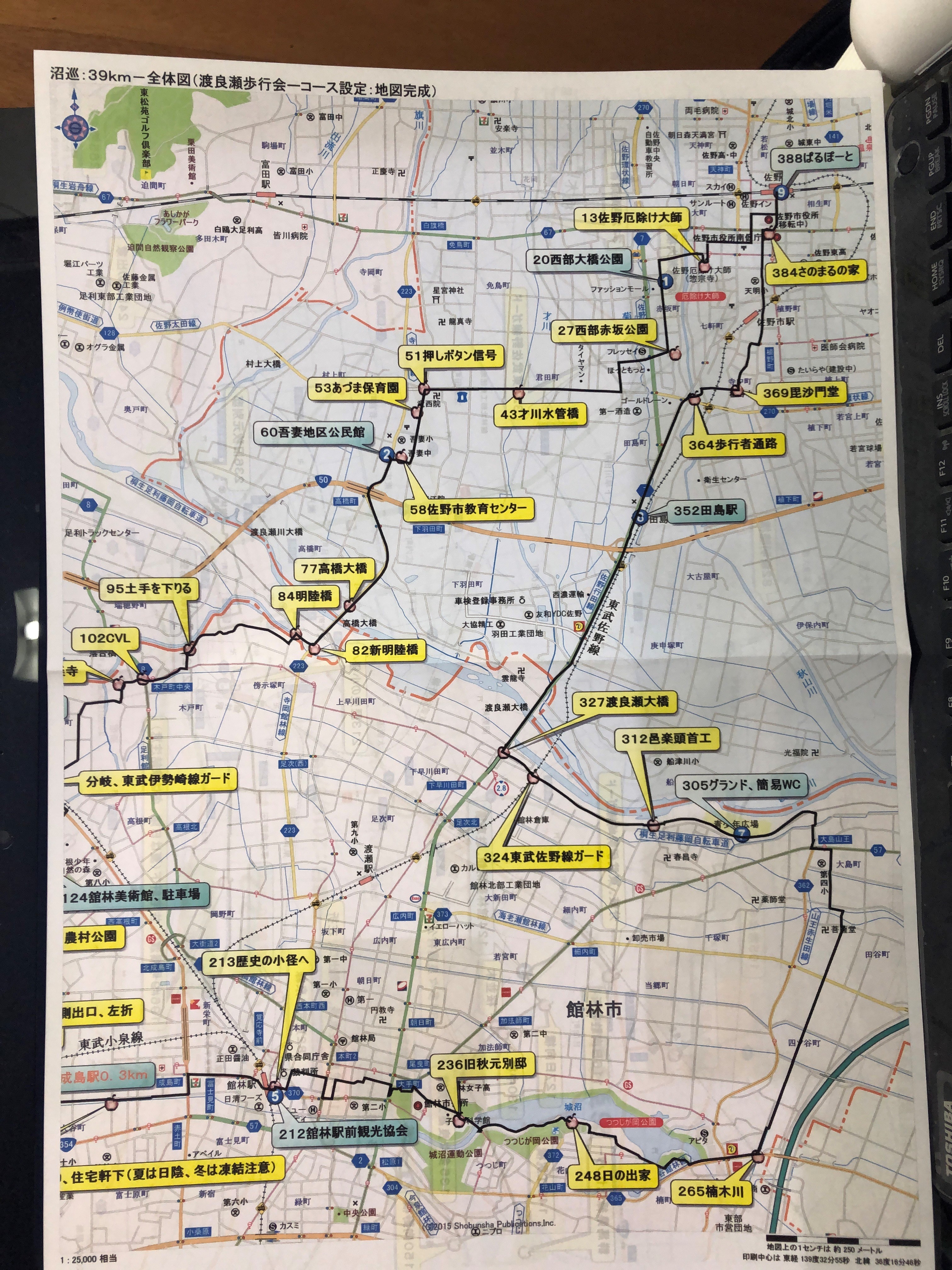 佐野駅城山公園口あづま家、SCP―①20西部大橋公園ー②60吾妻地区公民館ー③124館林市美術館、HCPー④161多々良沼公園ー⑤212館林駅前観光協会ー⑥236旧秋元別邸、MCPー⑦305館林市グランド、HCPー⑧352田島駅ー⑨388佐野駅、ぱるぽーと、GCP
