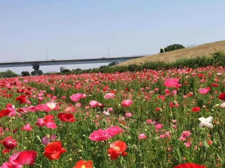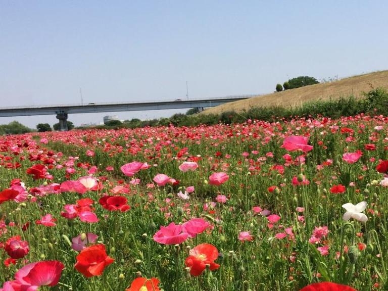 ○みどころ 松戸市の春の観光スポットのひとつ、「江戸川松戸フラワーライン」を歩きます。江戸川河川敷に広がる約2ヘクタールの花畑です。ちょうどポピーが見ごろの時期をむかえています。