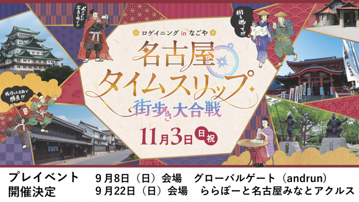 11月3日に開催される名古屋タイムスリップ~街歩き大合戦~のプレイベントを行います!ロゲイニングというスポーツを通して、この一帯に弘月スポット等をチームで巡り、名古屋の歴史と文化の魅力を再発見します。