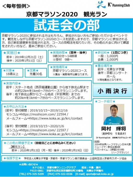 K+RunningClubでは、毎年恒例の「京都マラソン2 0 2 0 観光ラン」試走会を実施いたします!