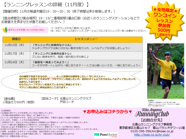 〇レッスンは少雨決行ですが、荒天により中止等の場合、予備日に延期して開催する場合がございます。予備日:12月の木曜日同時刻