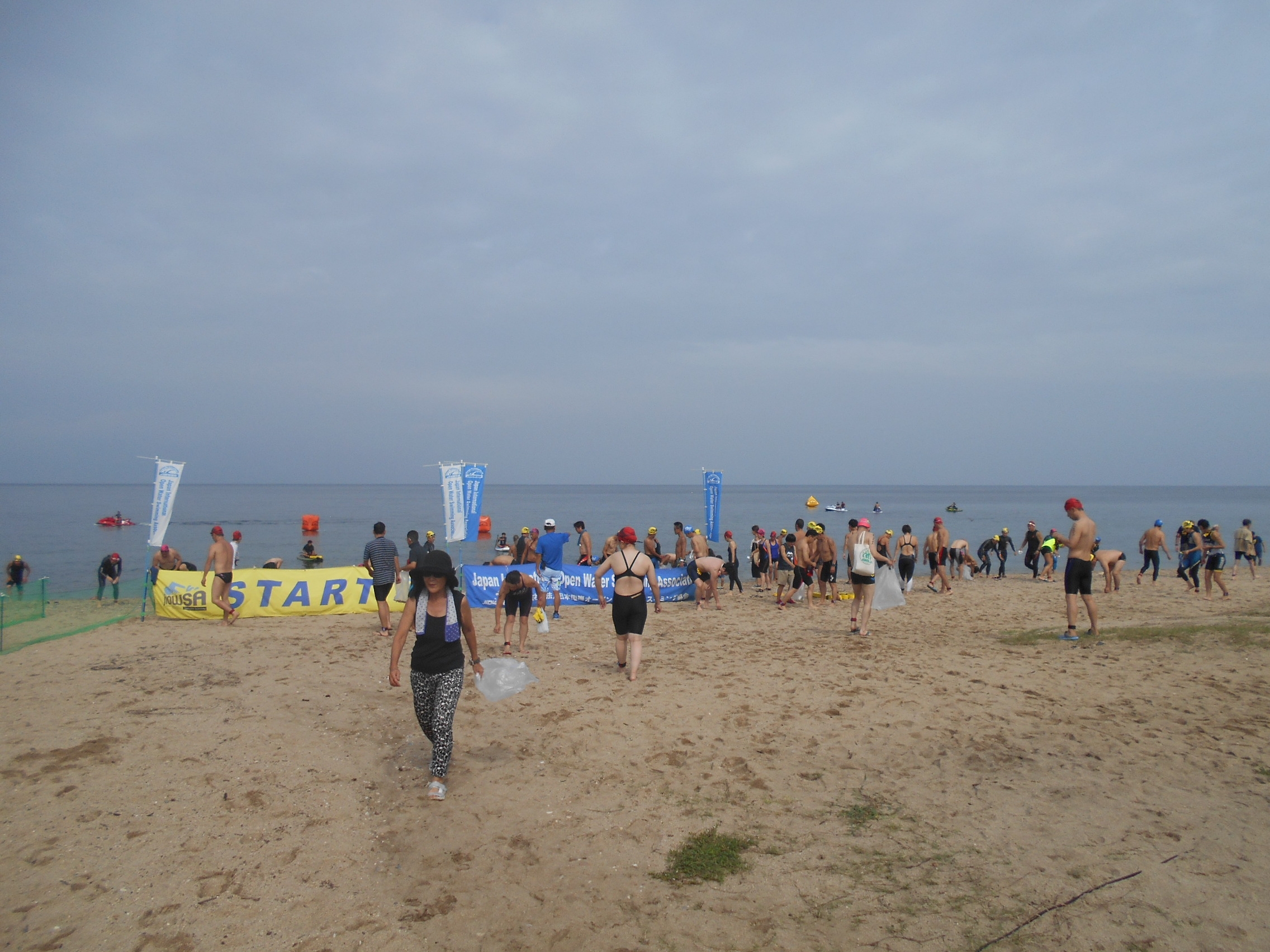 必ず大会プログラムをあらかじめ確認のうえ選手召集をしていただきます。スタート方法は水中スタート・いっせいスタート方式となります。※但し安全確認の都合上、海上監視スタッフからの指示で時間が変更になる場合があります。