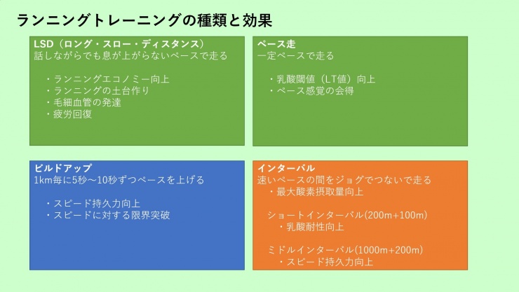 LSD、ペース走、インターバル走、ビルドアップ走、レペティション、セット走などがあります。