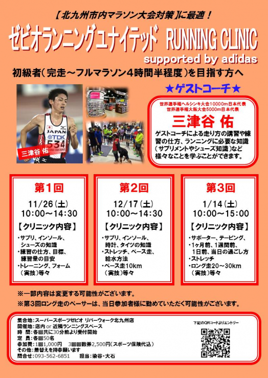 ゼビオランニングクリニック第3弾! 今回も元トヨタ自動車九州で活躍された三津谷佑さんを特別講師にお招きします!今回は毎回大好評のロング走(約20km)を実施します!