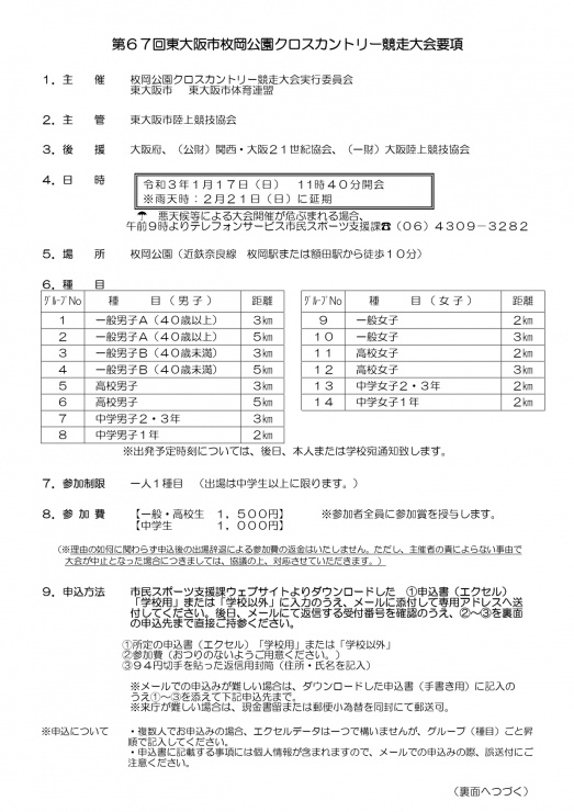 令和3年2月21日(日)開催予定としていました第67回枚岡公園クロスカントリー競走大会は緊急事態宣言が延長されたことに伴い、関係団体とも協議の結果、中止の判断をさせていただきました。