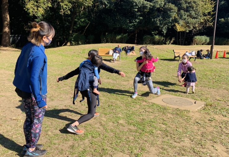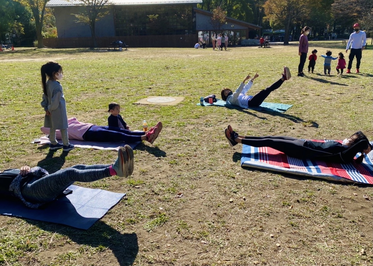 公園内の芝生の上で、子供と一緒にできるトレーニングを