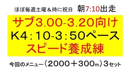 2000m(K4:00→3:55)→間1分jog→300m(K3:50より速いペースで) 間2分