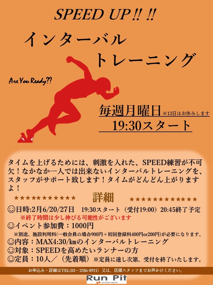 イベント詳細:タイムを上げるためには、刺激を入れた、SPEED練習が不可欠!なかなか一人では出来ないインターバルトレーニングを、スタッフがサポート致します!タイムがどんどん上がりますよ!