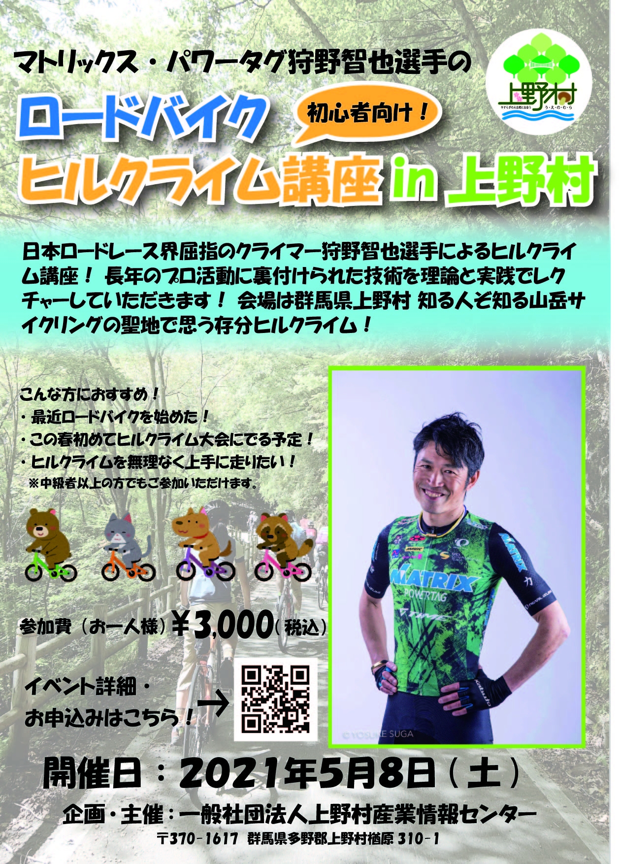 今回はそんな上野村を舞台に、日本ロードレース界屈指のクライマー狩野智也選手によるヒルクライム講座を開催します!