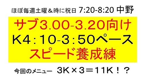 ・休憩の間ゆっくりジョグしつつ3本走り切る(サブ3.05以内の走力を想定)