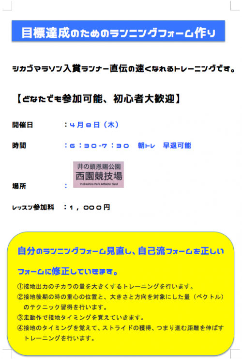 4/8(木)朝トレ!井の頭恩賜公園 西園競技場 ランニングフォーム改善! 受付終了