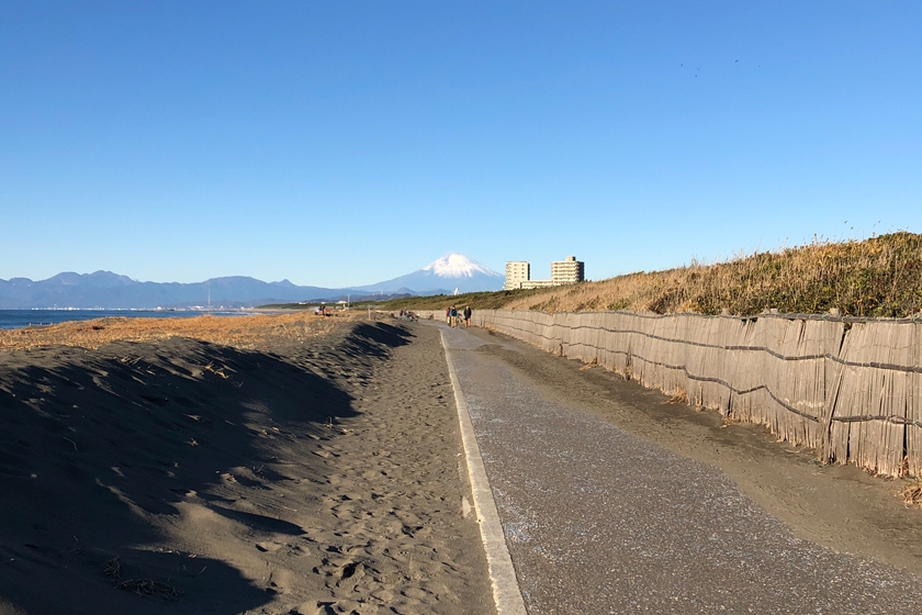 湘南の海沿いサイクリングロードを、江ノ島や富士山を眺めながら走ります。