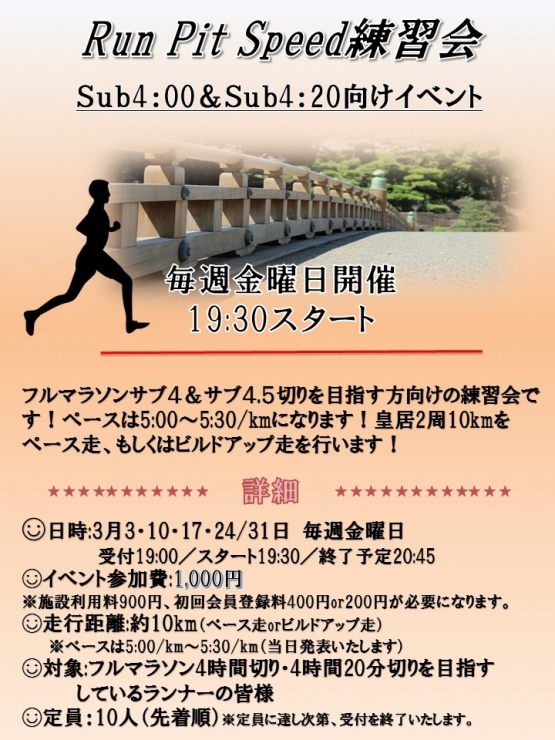 フルマラソンサブ4&サブ4.5切りを目指す方向けの練習会です!ペースは5:00~5:30/kmになります!皇居2周10kmをペース走、もしくはビルドアップ走を行います!