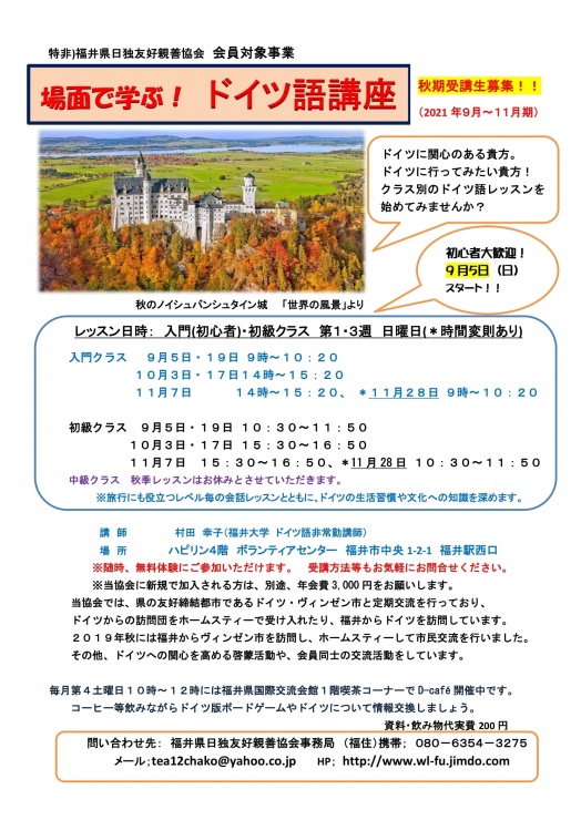 2021年9月秋季ドイツ語講座開講 福井県日独友好親善協会会員対象事業。 受付終了