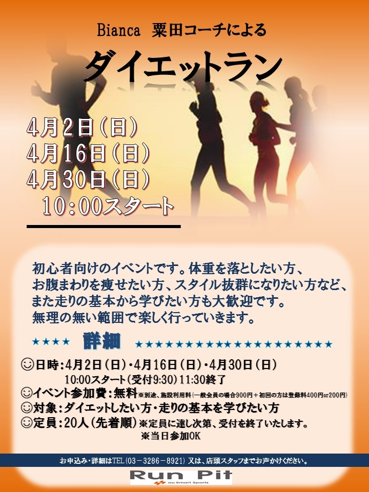 初心者向けのイベントです。体重を落としたい方、お腹まわりを痩せたい方、スタイル抜群になりたい方など、また走りの基本から学びたい方も大歓迎です。無理の無い範囲で楽しく行っていきます。
