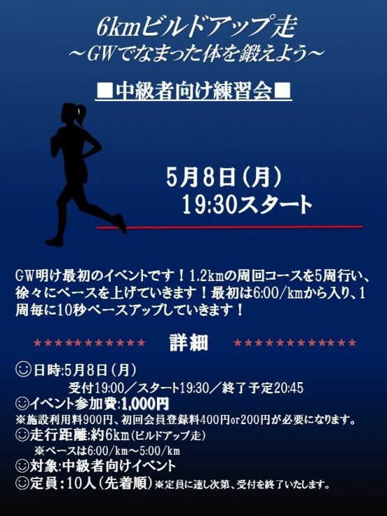 GW明け最初のイベントです!1.2kmの周回コースを5周行い、徐々にペースを上げていきます!最初は6:00/kmから入り、1周毎に10秒ペースアップしていきます!