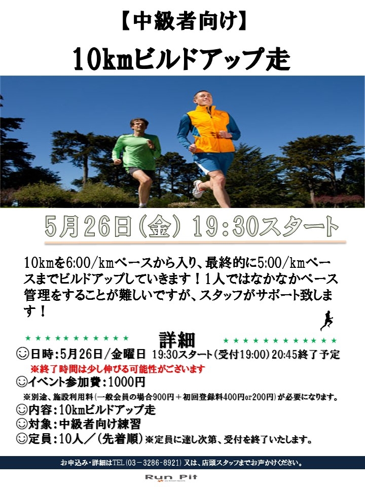 10kmを6:00/kmペースから入り、最終的に5:00/kmペースまでビルドアップしていきます!1人ではなかなかペース管理をすることが難しいですが、スタッフがサポート致します!