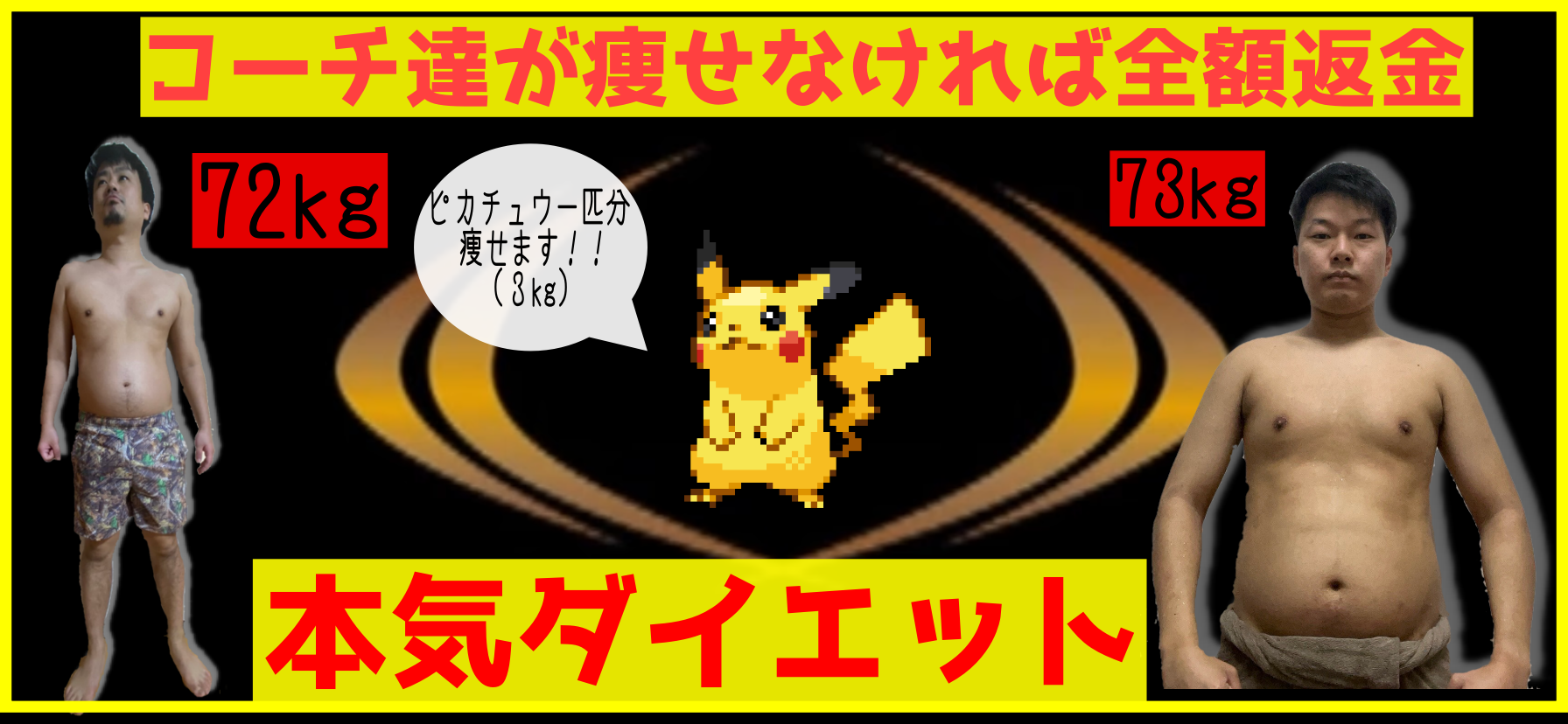 このプログラムでは1ヶ月かけて日常生活の質向上、基礎代謝向上、筋トレとランニングの習慣付けを目指し、カラダを変えるプログラムです。目標数値は体脂肪率のマイナス、ウエスのマイナス、体重のマイナスをそれぞれ目標を決めて頑張ります。コーチとカウンセリングをして目標を決めます。それぞれの目標に向けてがんばっていきましょう。コーチ達はピカチュウ一匹分(3kg)痩せます。失敗したら全額返金します。これはもう痩せるっきゃない。俺たちは本気だ。みんなはどうだ?