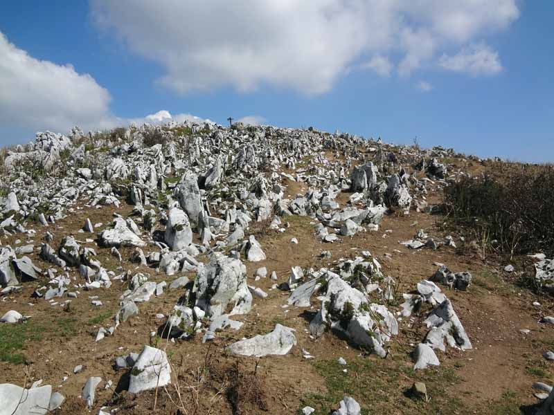 中山道を挟んで伊吹山と対峙する霊仙山(標高1084m)は、鈴鹿山脈北端の名峰です。山頂一帯はゆるやかな曲線を描く石灰岩のカルスト台地で、日本アルプスを思わせる雄大な景色が広がります。