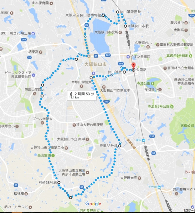 南海大阪狭山駅(スタート) → 狭山藩陣屋跡 → 府立狭山池博物館 → 狭山池 → 天野街道 → 三都神社 → 天野街道(穴地蔵) → 狭山神社 → 南海金剛駅(ゴール)