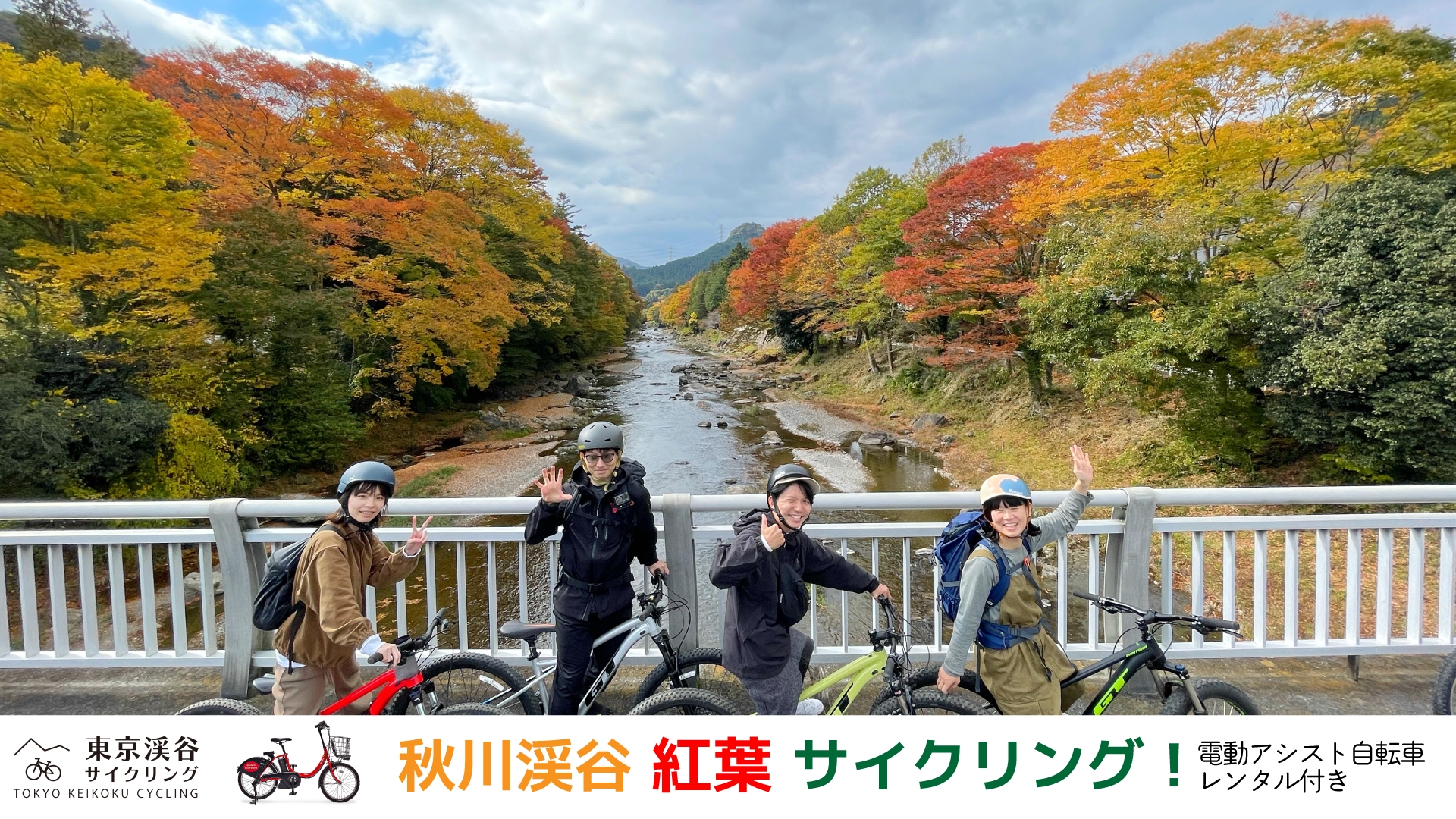 - ガイドの先導で電動アシスト自転車で紅葉サイクリング。 秋川渓谷の紅葉の名所を巡ります(午前)