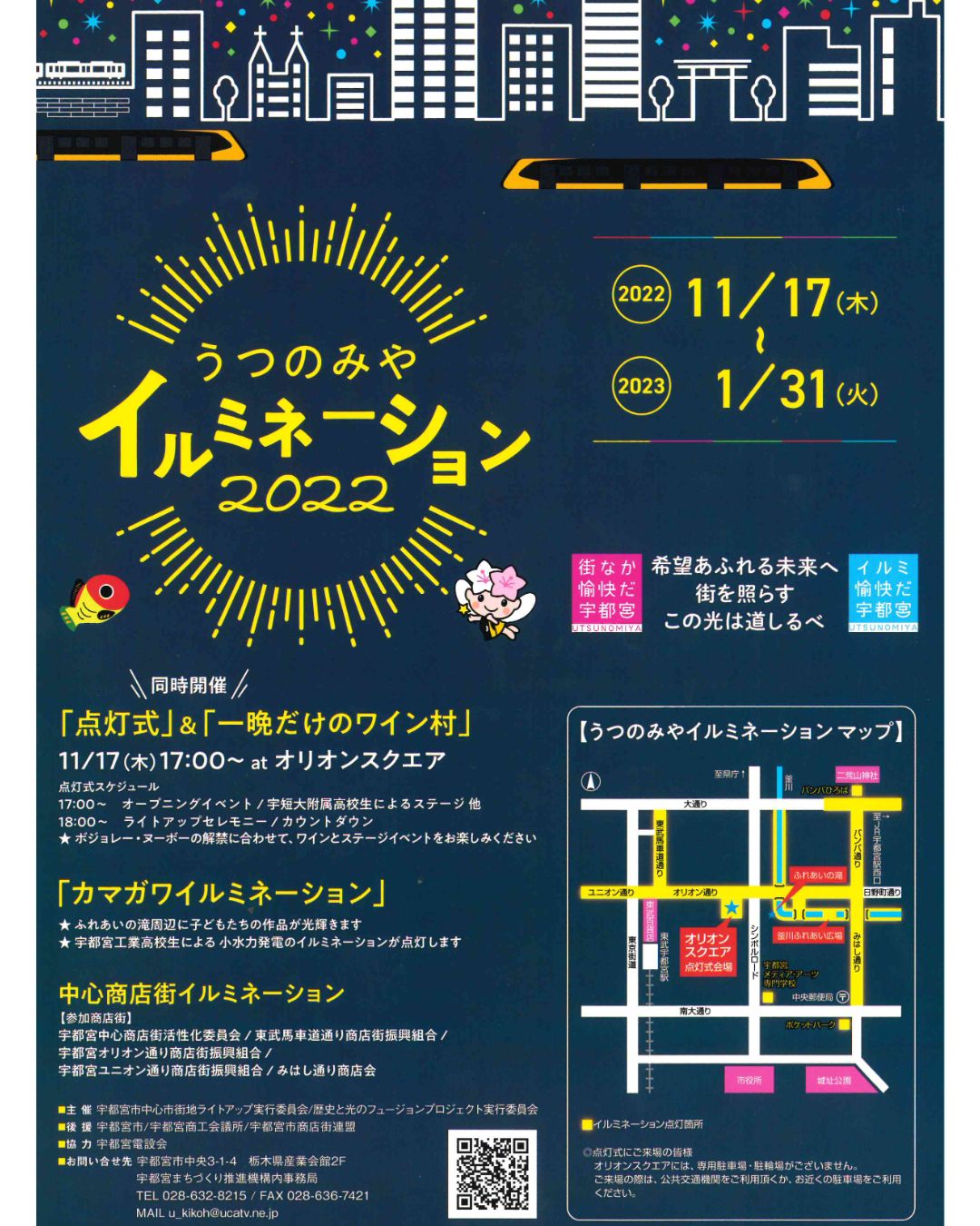 宇都宮市中心部のオリオンスクエアや各商店街、釜川沿いなど、街中の各スポットに、光輝く約20万個のイルミネーションを観ながらナイトゆるランしましょう♪(/ω\*)美しい光に彩られた宇都宮の夜の街歩きは格別です♪o((〃∇〃o))♪
