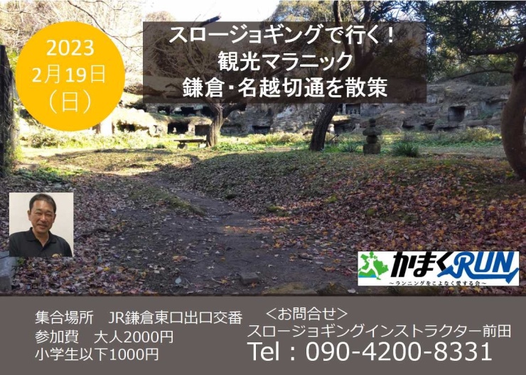鎌倉駅より大町口から名越切通ハイキングコースを散策し、巡礼古道・ハイランドコースを通り鎌倉駅へ戻ってくるコース。平坦な道はスロージョギングで、ハイキングコースの約2㎞はすべて歩いて進みます。