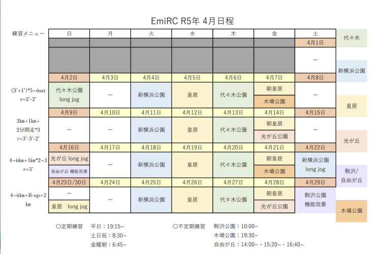 ※2、5回のうち、別拠点での練習会(代々木公園・皇居)の参加も可能とします