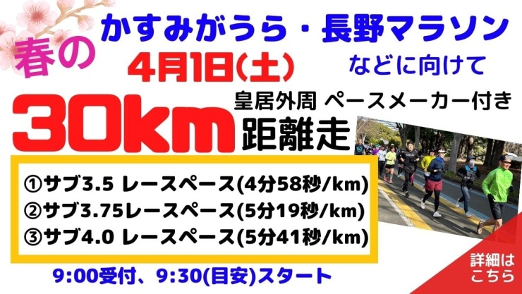 春先に貴重な30kmの距離走練習会を開催します。サブ3.5~4.0付近を目標にするランナーが対象です。それぞれにペースメーカーが付きます。皇居5km周回コースを6周です。
