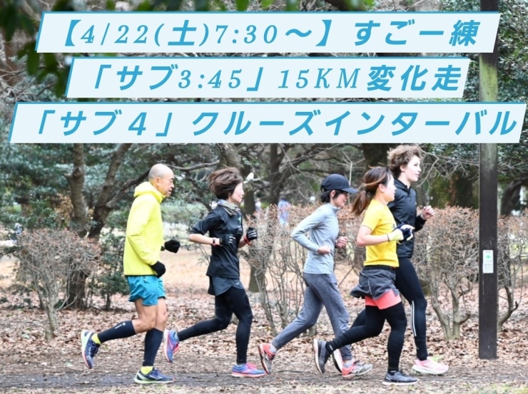 【4/22(土)7:30~】すごー練 「サブ3:45」15km変化走・「サブ4」クルーズインターバル 受付終了