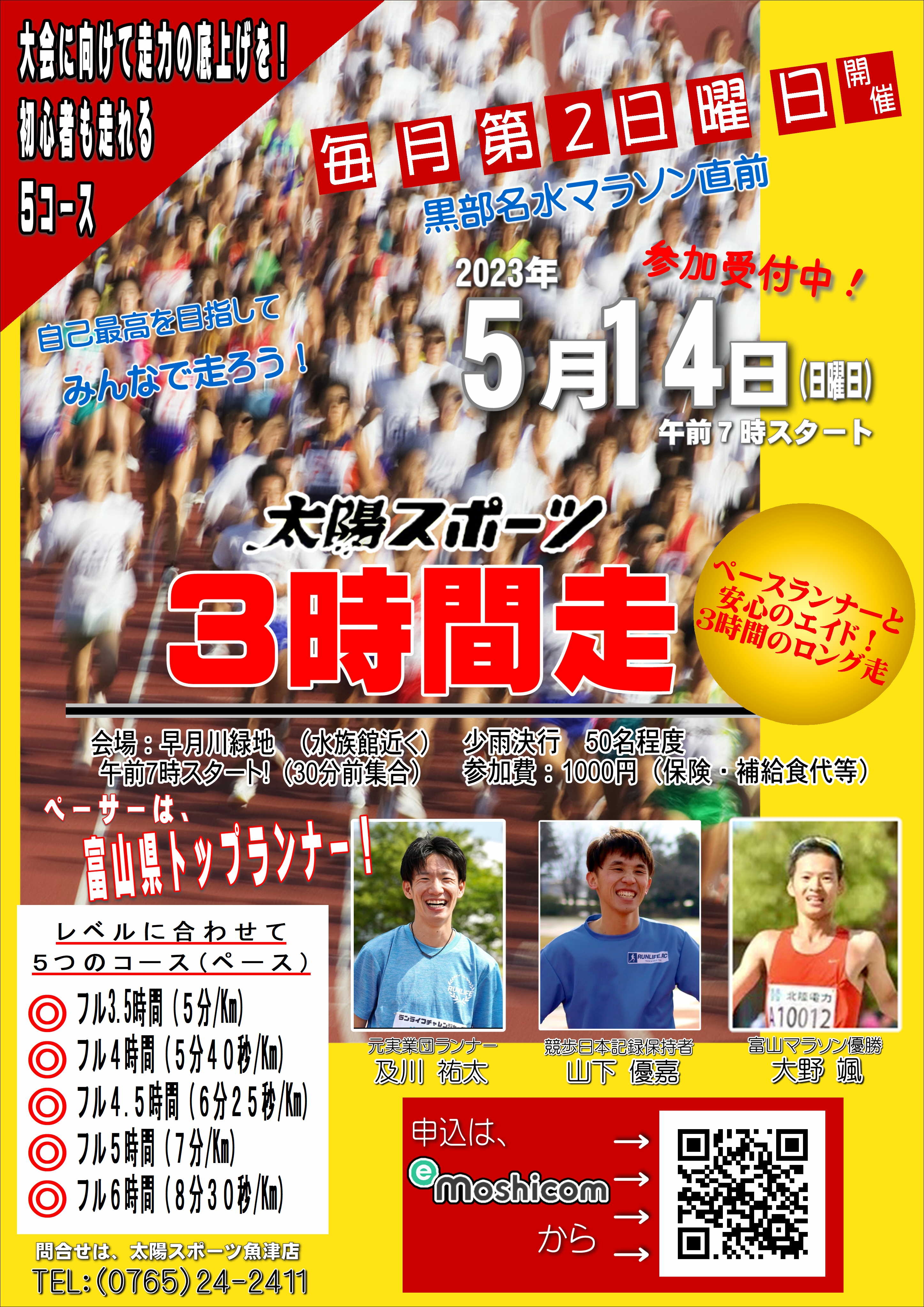 魚津店では3時間走を9月までの第2日曜日に朝7時スタートで開催いたします。