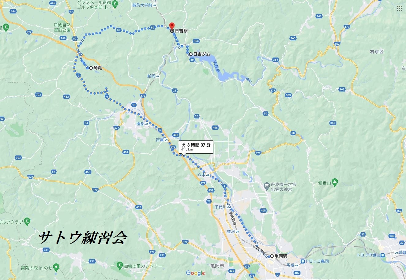 JR亀岡駅→JR八木駅→JR園部駅→琴滝公園→須知城跡→道の駅丹波マークス→日吉ダム→道の駅スプリングひよし→JR日吉駅(解散)