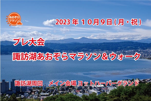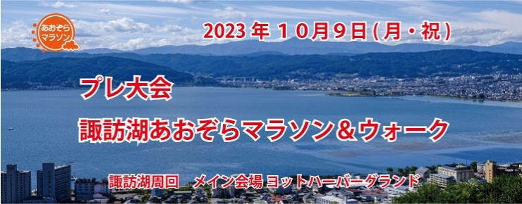 大会名 プレ大会 諏訪湖あおぞらマラソン&ウォーク 開催日 2023年10月9日 (月・祝) 開催地 諏訪湖周回 メイン会場:ヨットハーバーグランド 諏訪市高島3-1201-34先 アクセス 〈電車〉JR中央線「上諏訪」駅、「下諏訪」駅、 「岡谷」駅よりアクセス 〈車〉中央自動車道「諏訪」ICより約5km ※駐車場 : 200台 一般利用者もご利用になります。公共交通機関をご利用ください。 ※本大会は、2024年10月(日付未定)を予定しています。 コース :諏訪湖1周16kmを基本コースとします。 (※コースは整備工事等により安全を優先して変更になる場合 があります。) コース上での遵守事項(参加者は以下を守ってください) 1)ランナーは諏訪湖周回を左周り(半時計周り)、ウォーカーは諏訪湖を右回り(時計回り)併走や、横に広がって集団で歩くなど、一般の歩行者・車両・他のランナー、ウォーカーの迷惑になる行為は行わないでください 2)整備されているコースでは、ランナー・ウォーカー・自転車利用の区別が明示されている 箇所があります。必ず、参加種目により設定ルールを守ってください。 3) 特にウォーク参加者は緊急時のために十分充電をした携帯電話を持参ください。当日の緊急電話番号は参加通知でご案内します。 4) 天候の変化に備えて、雨具・防寒具を各自持参してください 種目・参加資 <マラソンの部> ・諏訪湖3周ウルトラマラソン男女(48km)18歳以上制限時間6時間 ・ 諏訪湖2周マラソン男女(32km)18歳以上 制限時間4時間15分 ・ 諏訪湖1周マラソン男女(16km)18歳以上 制限時間2時間 <ウォーキングの部> ・チャレンジ諏訪湖1周ウォーク(16km)性別制限なし 制限時間5時間30分 ◆ウォーク一般 (高校生以上) ◆親子ウォーク (中学生と 保護者1名) ※注1)親子ウォークは18歳以上の保護者とお子様5名までエントリーできます。 ※注2)上記の保護者は子の親が認めた者であれば血縁は問いません。 ※中学生未満のお子様は無料です。ゴール後完歩金メダル差し上げますので、受付 で氏名・年齢を登録していただきます。 ※ウォーク種目は競争ではありません。 記録計測は行いますが、種目の特性より順付けは 行いません。それぞれの目標・目的をもってこの機会を楽しんでください! 参加料(税込) <マラソンの部> ・ 諏訪湖3周ウルトラマラソン男女 5, 830円/1名(税込) ・ 諏訪湖2周マラソン男女 5, 280円/1名(税込) ・ 諏訪湖1周マラソン男女 4, 730円/1名(税込) <ウォーキングの部> ・チャレンジ諏訪湖1周ウォーク ◆ウォーク一般 (高校生以上) 4,200円/1名(税込) ◆親子ウォーク 保護者1名とお子様1名 5,200円/組(税込) 保護者1名とお子様2名以上5,200円/組にお子様1名につ き1,000円加算 (例:お子様3名の場合 52,000円+1,000円×2名=7,200円) 申込締切日 2023年9月11日(月)(各インターネットエントリーサイト) 9月14日(木)(大会ホームページからの申し込み) 受付時間 <マラソンの部> 8:00 ~ 9:00 ・ 諏訪湖2周マラソン男女 ・ 諏訪湖1周マラソン <ウォーキングの部> 8:00 ~ 9:00 ・チャレンジ諏訪湖1周ウォーク 受付場所 諏訪湖 ヨットハーバーグランド特設会場 開会式 ※大規模な開会式はありませんが、スタート前にスタ ッフが注意事項お伝えします。 スタート時間 <マラソンの部> 9:30 ・ 諏訪湖3周マラソン男女 ・ 諏訪湖2周マラソン男女 ・ 諏訪湖1周マラソン ※スタート招集 9:20 マラソンの部は全種目一斉スタートを行います。 <ウォーキングの部> ・チャレンジ諏訪湖1周ウォーク 8:15 ~ 9:15 大会終了時刻 ※受付後、準備ができた方から順次、ゼッケン装着のICタグのセンサータッチチェック後時間内に順次スタートしていただきます。9:15を過ぎてのスタートはできません。 スタート・ゴール 諏訪湖 ヨットハーバーグランド特設会場 参加賞 オリジナルスポーツタオル(予定) 参加特典 本大会は、R6年度に本大会1回目を安全に開催するためのテスト大会です。テスト大会に 参加ご協力いただく皆様全員に、以下の特典を用意します。 1) 本大会参加者は、第一回大会エントリーに利用できるフューチャークレジット@2000円OFF権利を進呈します。 2) 昨年のテスト大会1へも参加いただき、今回本大会へ参加いただいた場合、第一回大会へ無償(協力者枠)ご招待いたします。 表彰 ※当日簡易賞状で上位入賞者表彰を行います。 個人走各種目 男女別総合 1位~3位 ※ウォーキング種目は競争ではありません。湖とウォーキングをとことん楽しんでいただく種目です。従いまして、記念のために記録計測は行いますが、順位表彰はしません。 <後日表彰> 個人走各男女別(ウォーク種目除く) 年代別表彰 39歳以下・40歳代・50歳代・60歳代・70歳代・80歳以上 上記年代別表彰は、大会3日後予定で大会ホームページの 公式結果サイトに各入賞者表彰状を掲載し、栄誉を称えま す。年代別表彰には副賞品はありません。 ※表彰賞状以外、年代別順位の公表は致しません。 ※年代別表彰を希望しない方は事務局へ事前にご連絡ください。 <記録証> ・完走記録証公式デジタル版にて、大会後3日の予定で大会公式ホームペ 