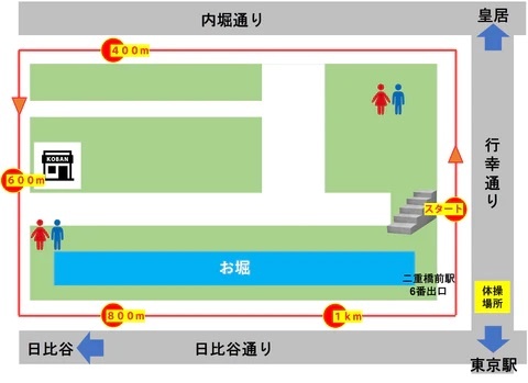 コースは皇居近くの二重橋を順時計周りで行います(1.165km/1周)