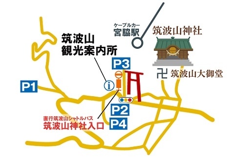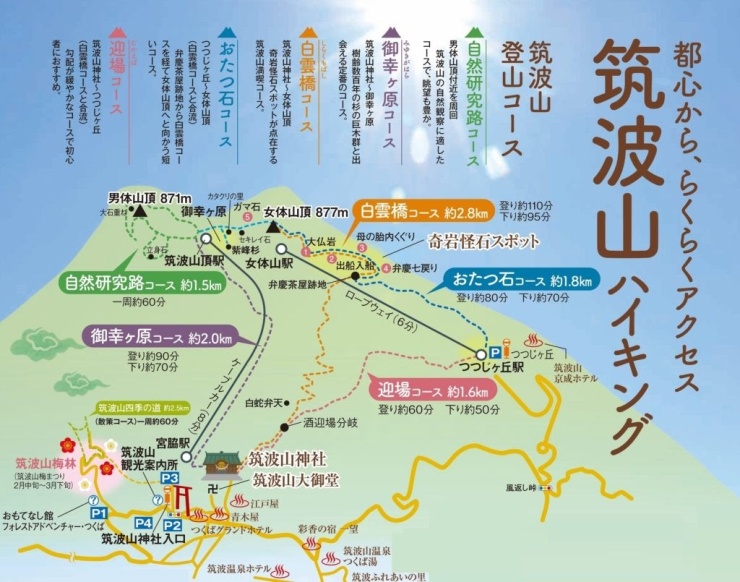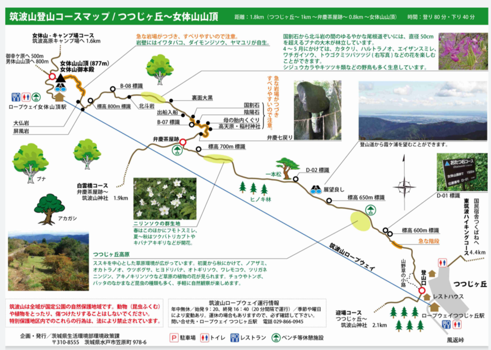 筑波山頂へ登るには、宮脇駅から男体山頂(871m)まで登ることができるケーブルカー、つつじヶ丘駅から女体山頂(877m)まで登るロープウェイが便利です。